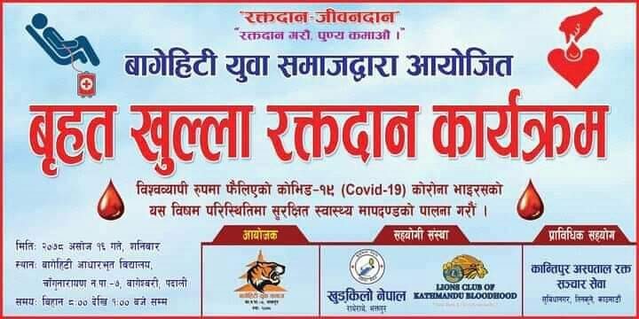 We express our gratitude to all blood donors, volunteers and helpers who participated in the Corona havoc awareness and blood donation program organized at Changunarayan Municipality Ward No. 7 on 2078/06/16.