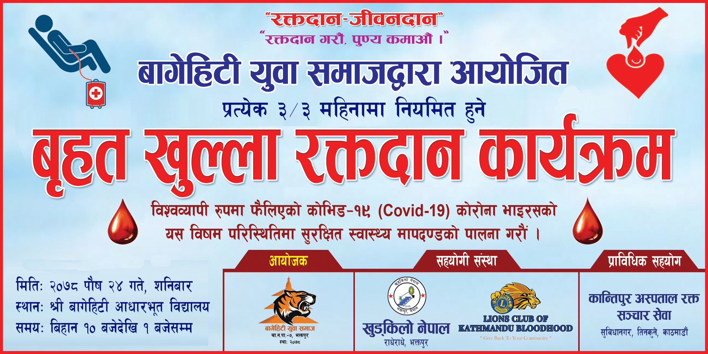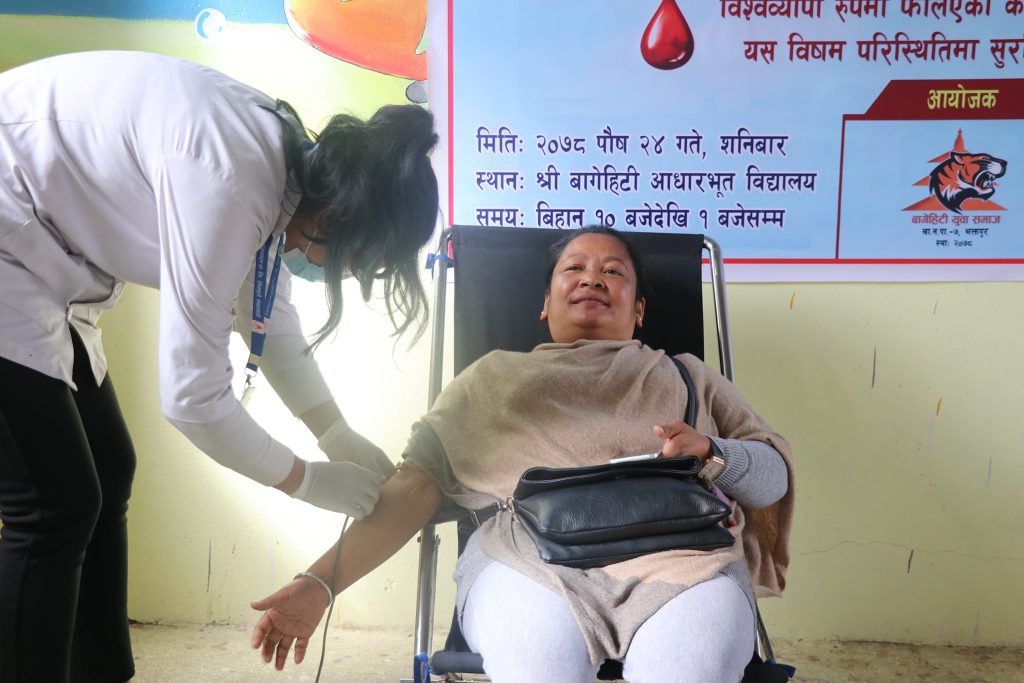 Date 2078-Paush 24 Saturday, Chagunarayan Municipality 7 Shri Bagehiti Aadharbhut School, Bagmati State Physical Infrastructure Development Minister Honorable Krunna Lal Bhadel, accepted our invitation and inaugurated Bagehiti Yuva Society and organized a huge open blood donation program, formally inaugurated Bagehiti Yuva Society. We would like to express our heartfelt gratitude for gracing the huge open blood donation program. I would like to express my gratitude to all the blood donors who donated blood during the huge open blood donation program.