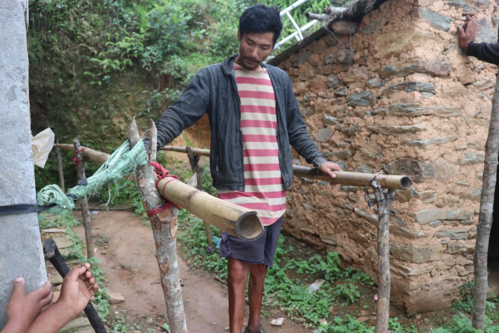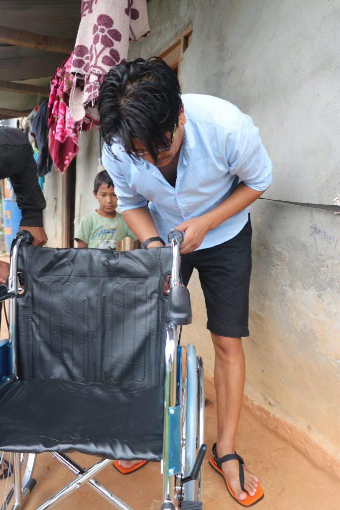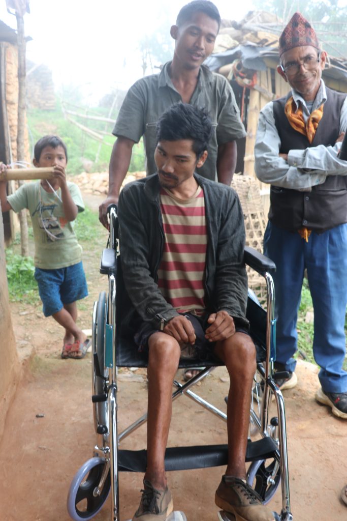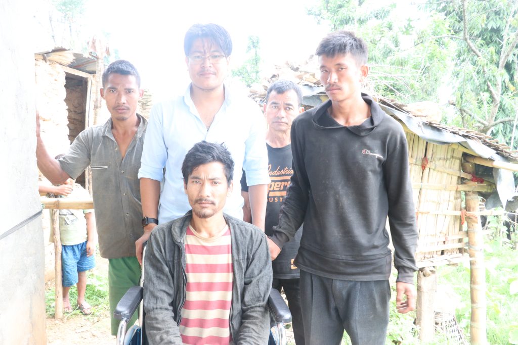 Likhutama koshi Village, Ward No. 3, Kholma Village, Ramechhap resident, Man Bahadur Tamang, aged 28, providing a wheelchair at his residence. In addition, discussion with Ward President Gopal Tamang Jr. for the upcoming program along with Dinesh Kumar Nayaju and Neeraj Shrestha on the date June 30, 2022.